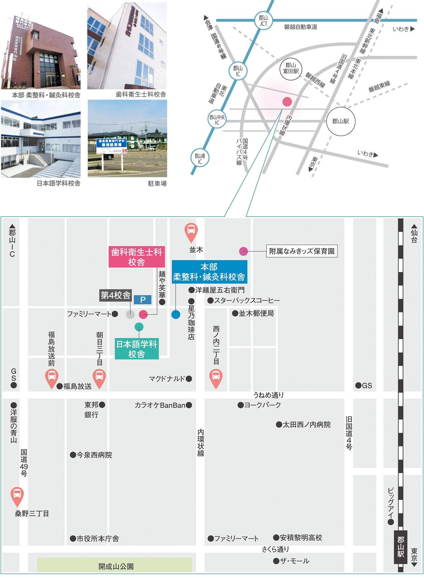 郡山駅よりさくら通りを直進。旧国道4号線を右折して約750m先の若葉町交差点を左折し、うねめ通りを西へ約2km。カラオケBanBanの交差点を右折し、一つ目の信号を左折。約50m行くと、左手に本部・柔整科・鍼灸科校舎。さらに約100m進めば歯科衛生士科校舎。